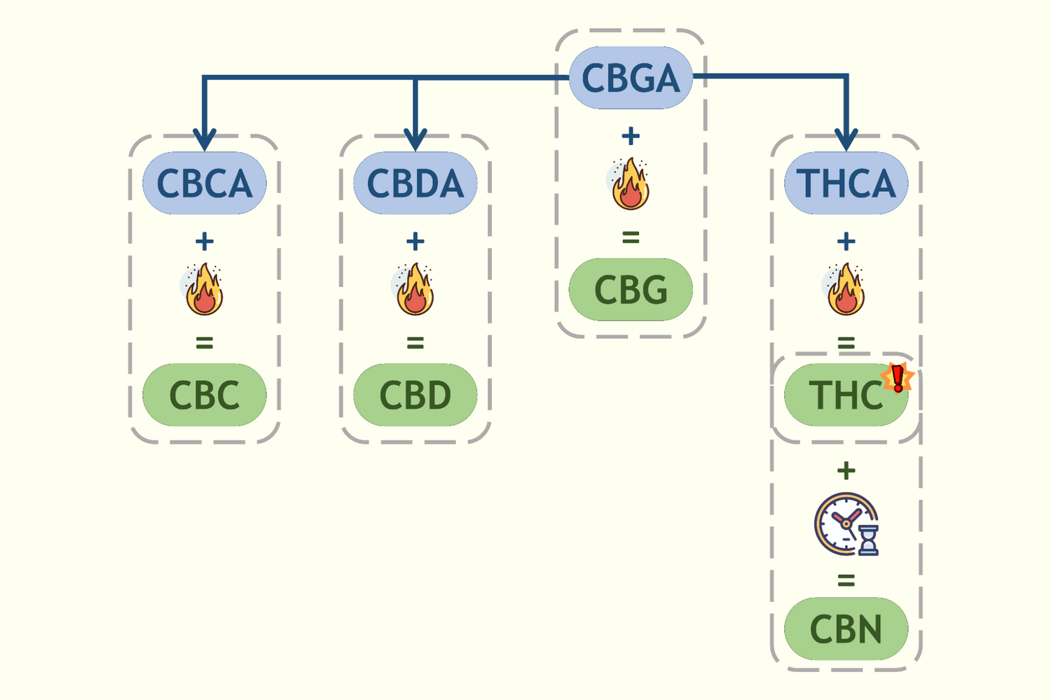 A planta, através de enzimas específicas, transforma o CBGA em diferentes ácidos canabinoides como o CBDA, o THCA e o CBCA.